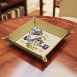 Featuring state-of-the-art UV printing technology, this valet tray promises permanent personalization that resists fading and peeling, with designs rendered in bold black that maintain their clarity indefinitely. The carefully selected vegan leather provides outstanding durability and texture while honoring cruelty-free values, and the corner-snap assembly system offers both stability during use and convenient collapsibility for storage. An essential organizational tool that honors military service while keeping everyday essentials like wallets, phones, and accessories beautifully arranged.