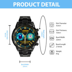 Personalize your Black Stainless Steel Watch with custom engravings of your name, rank, and years of service. This thoughtful addition transforms your watch into a cherished memento, honoring your dedication and commitment to service.