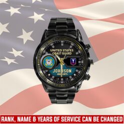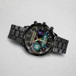 Customize your Black Stainless Steel Watch with your name, rank, and years of service for a truly one-of-a-kind timepiece. This personalized feature allows you to showcase your military journey with pride and distinction.