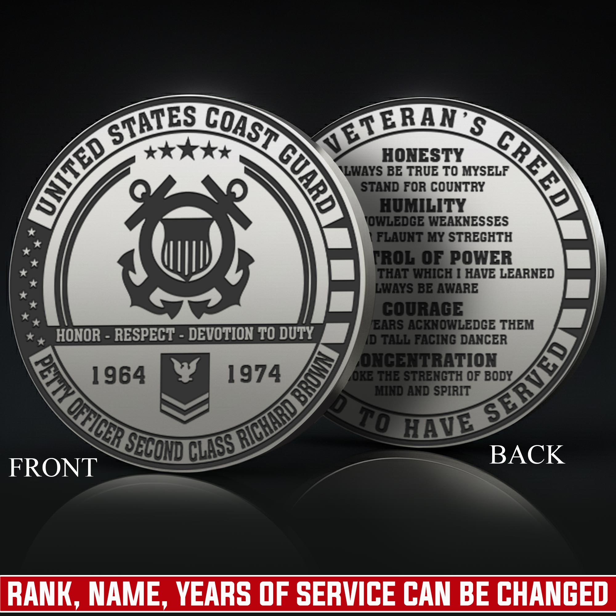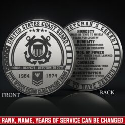 Honor Their Service: customize with veteran’s name, achieved rank, service branch, assigned unit, career specialty, or total years served on both coin faces.