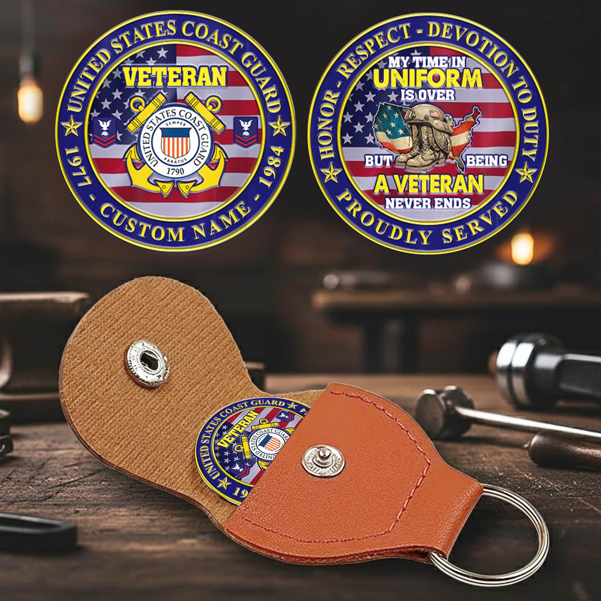 Built with respect and precision, the Veteran Honor Challenge Coin features professional-grade stainless steel with custom printing on both surfaces. Accompanied by a durable PU leather case with snap closure and keychain, it’s designed to last a lifetime.