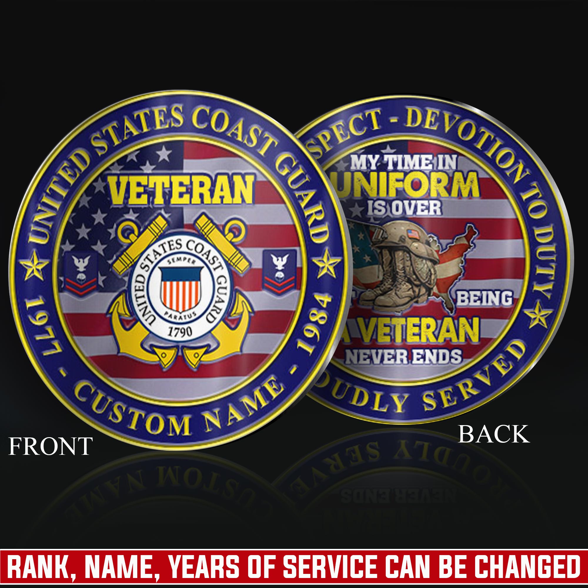 Create Your Legacy: personalize both sides with service member’s name, military rank, branch insignia, unit identification, occupational specialty, or service period dates.