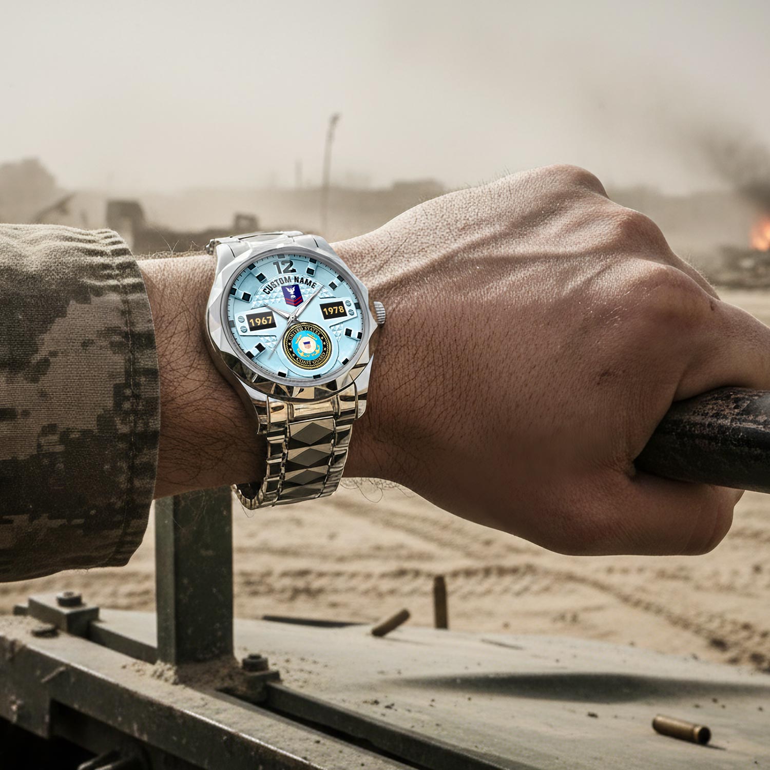 Personalize your Diamond-Cut Bezel Watch with custom engravings of your name, rank, and years of service. This thoughtful addition transforms your watch into a cherished memento, honoring your dedication and commitment to service.
