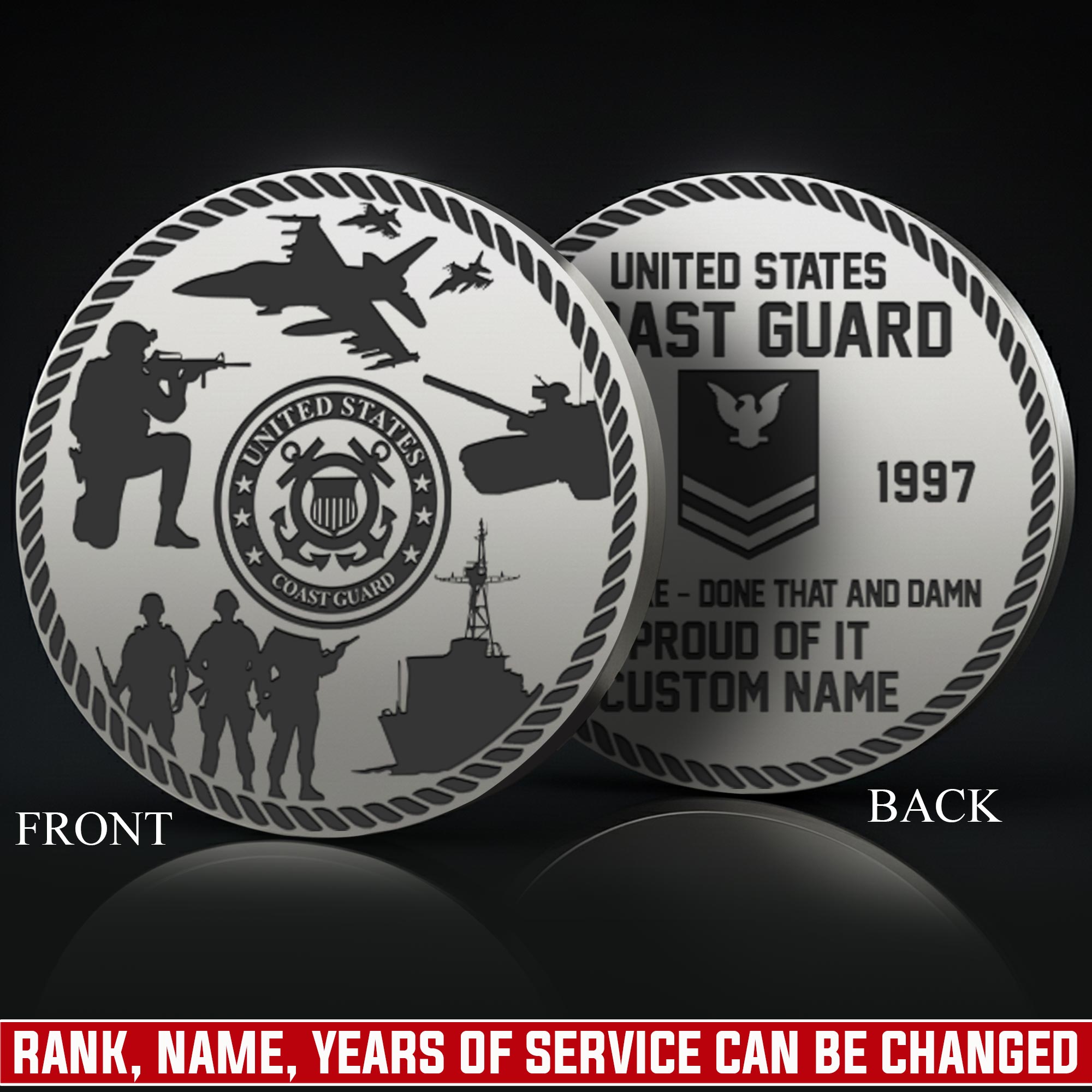 Honor Their Service: customize with veteran’s name, achieved rank, service branch, assigned unit, career specialty, or total years served on both coin faces.