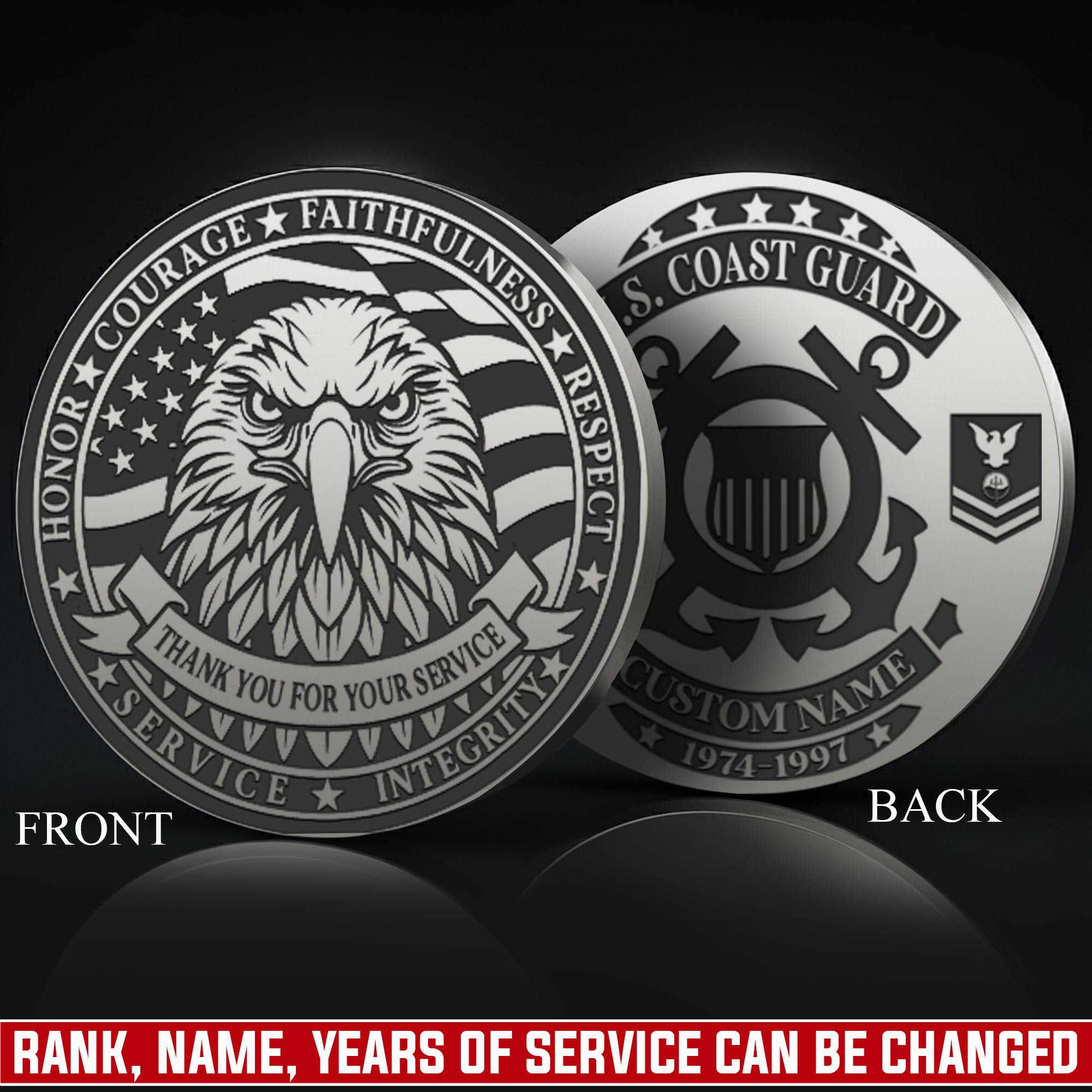 Add Your Personal Touches: you’re enabled to customize both sides of the coin with your name, rank, military branch, unit insignia, or service dates to create a personalized keepsake.
