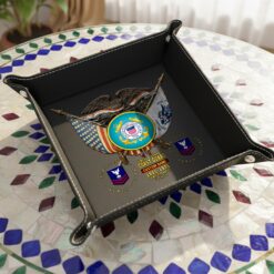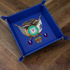 Featuring state-of-the-art UV printing technology, this valet tray promises permanent personalization that resists fading and peeling, with designs rendered in bold black that maintain their clarity indefinitely. The carefully selected vegan leather provides outstanding durability and texture while honoring cruelty-free values, and the corner-snap assembly system offers both stability during use and convenient collapsibility for storage. An essential organizational tool that honors military service while keeping everyday essentials like wallets, phones, and accessories beautifully arranged.