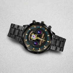 Elevate your Black Stainless Steel Watch with a personal touch by incorporating your custom details like name, rank, and years of service. This unique addition commemorates your military experience in a stylish and meaningful way.