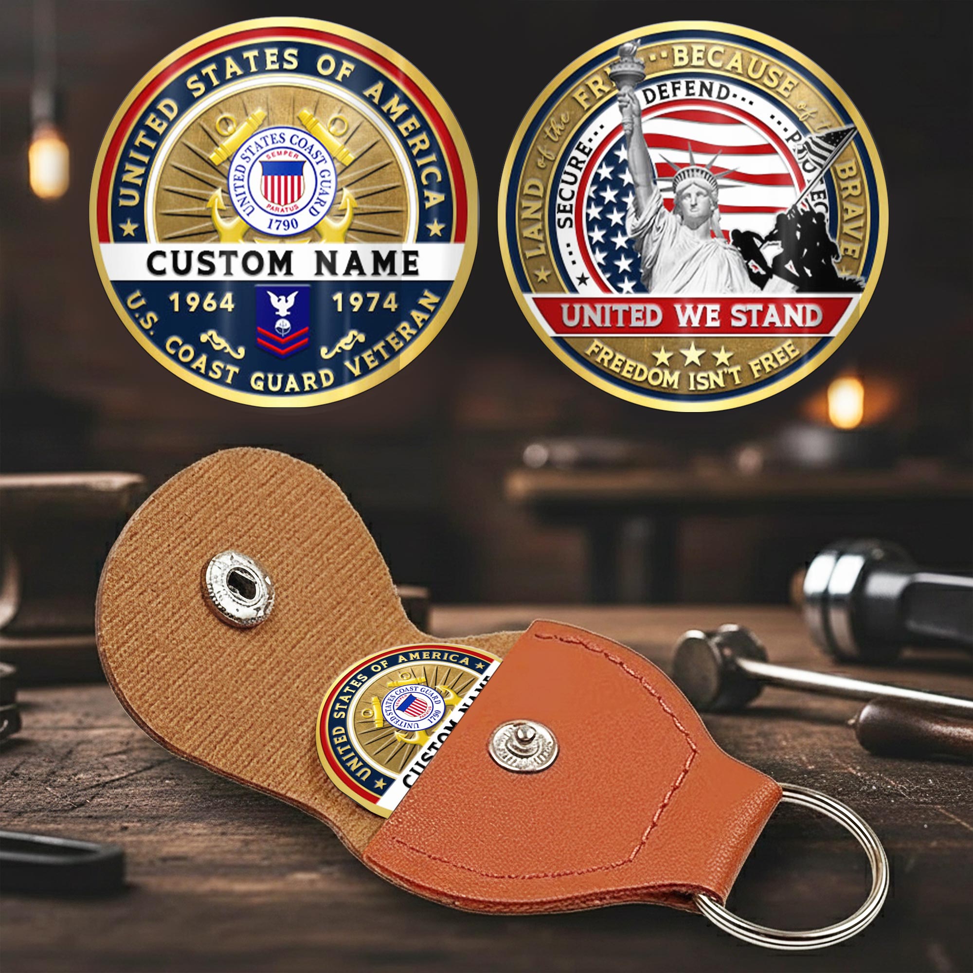 Honor the brave with the Personalized Military Challenge Coin, featuring double-sided custom printing on durable stainless steel. Complete with a premium PU leather protective case, this coin embodies the spirit of military tradition and honor.