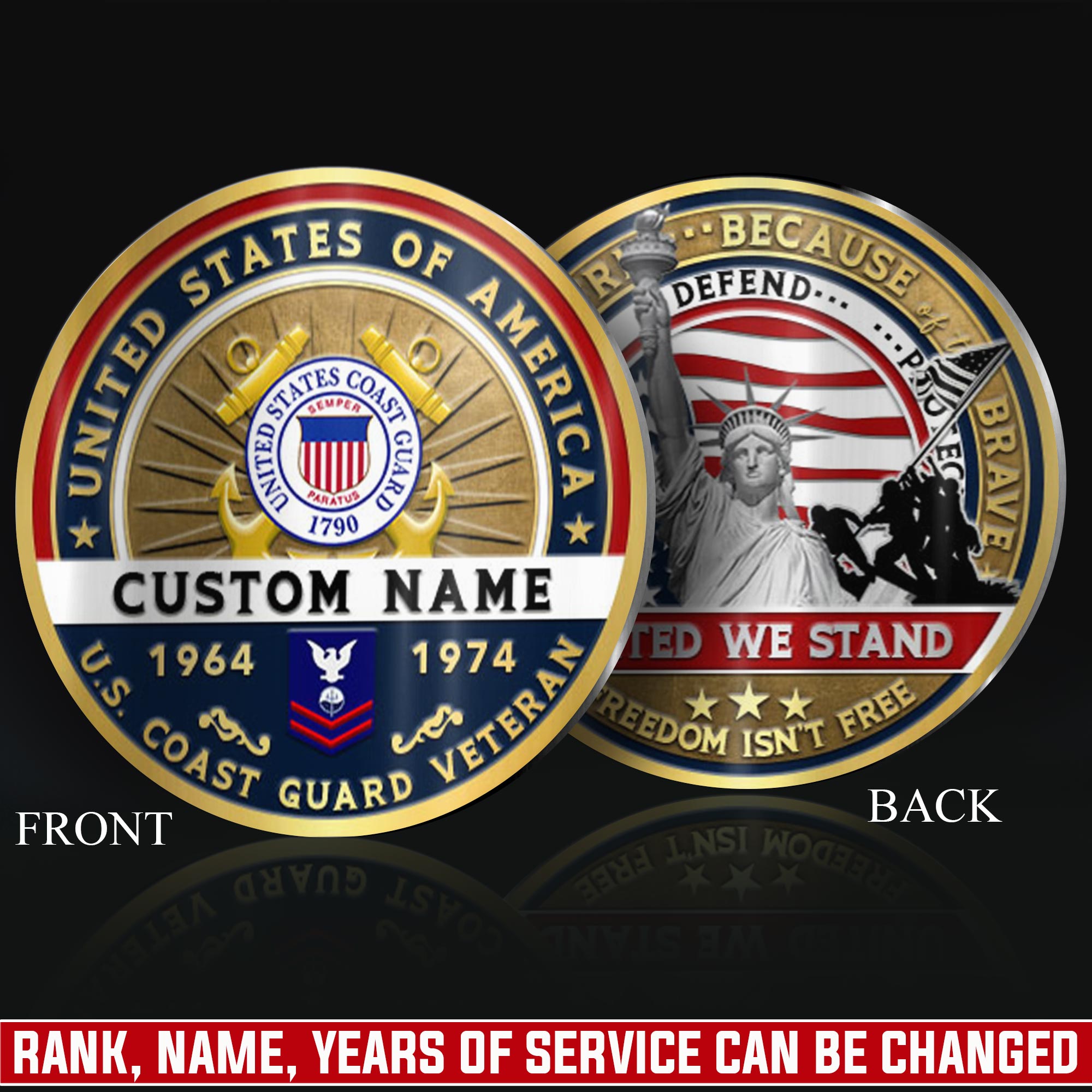 Create Your Legacy: personalize both sides with service member’s name, military rank, branch insignia, unit identification, occupational specialty, or service period dates.