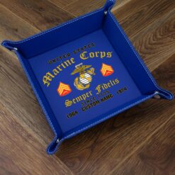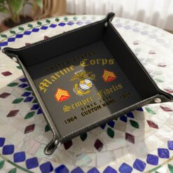 Employing cutting-edge UV printing technology, this valet tray delivers fade-proof and peel-resistant personalization that keeps your veteran design looking fresh indefinitely, with deep black engraving providing stunning contrast. The resilient vegan leather material combines ethical production with exceptional longevity, maintaining its appearance through countless uses, while the intuitive corner-snap design allows for effortless assembly and space-saving storage. An indispensable desk or nightstand companion that celebrates military service while providing an attractive solution for organizing keys, change, charging cables, and other daily necessities.
