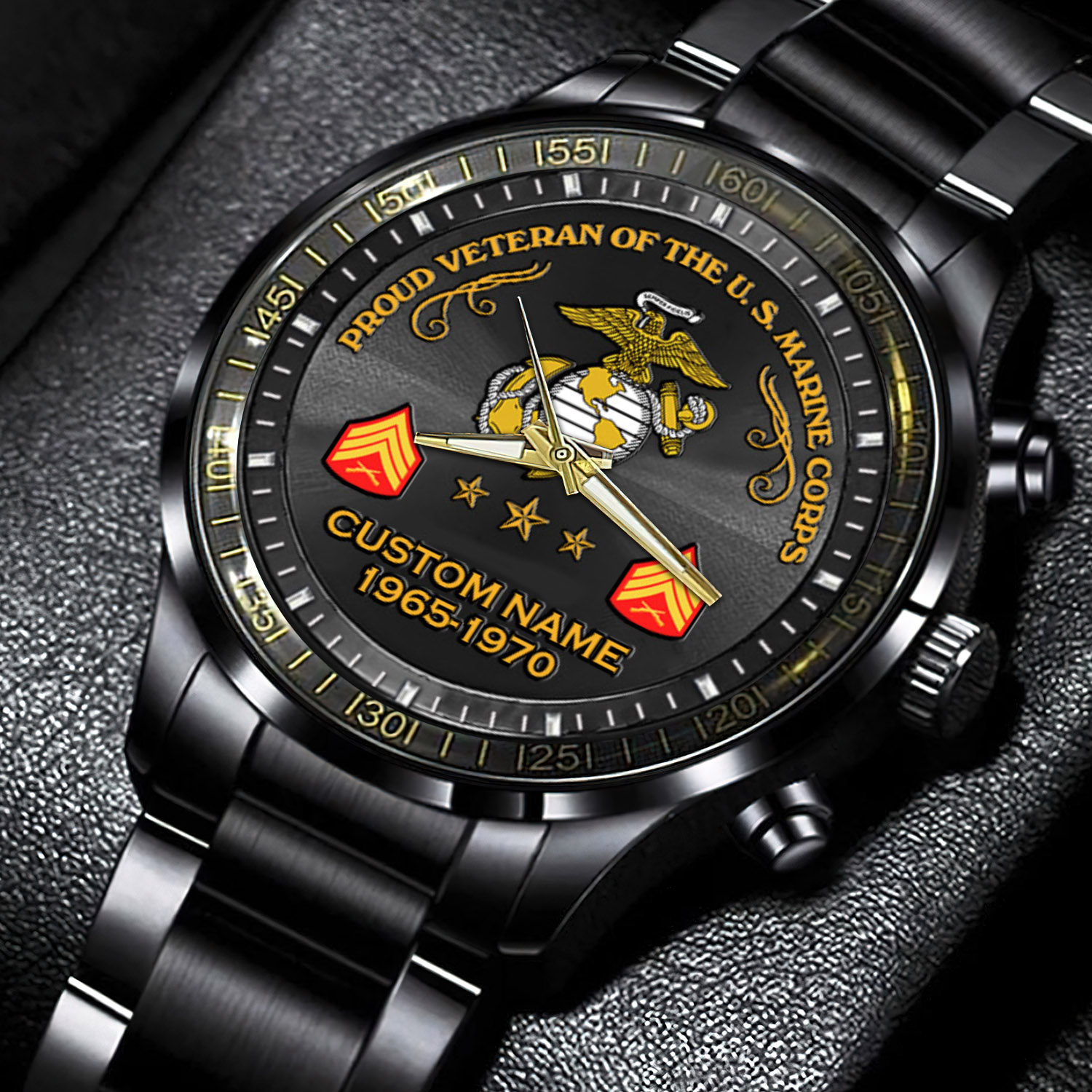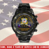 Customize your Black Stainless Steel Watch with your name, rank, and years of service for a truly one-of-a-kind timepiece. This personalized feature allows you to showcase your military journey with pride and distinction.