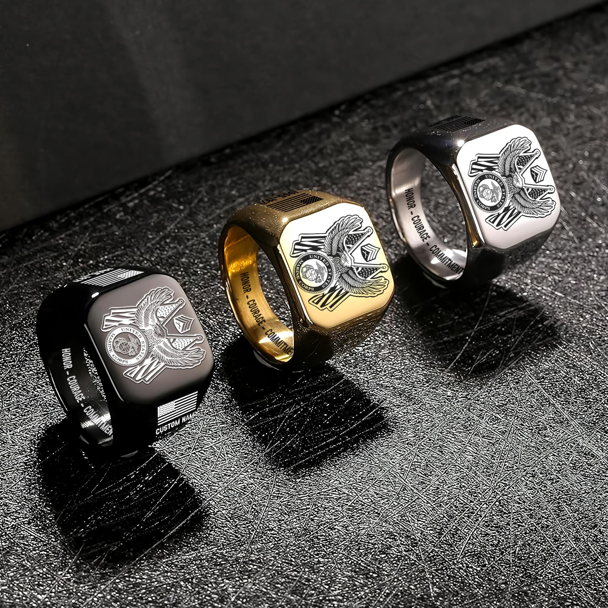 You’re enabled to customize your name, rank, rating, etc. to have them printed on the personalized engraved men’s ring. Create a unique piece that reflects your military journey and personal achievements.