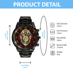 Make your Black Stainless Steel Watch a reflection of your personal journey by including custom details like your name, rank, and years of service. This personalized feature not only adds a touch of elegance but also serves as a timeless tribute to your dedicated service to our country.