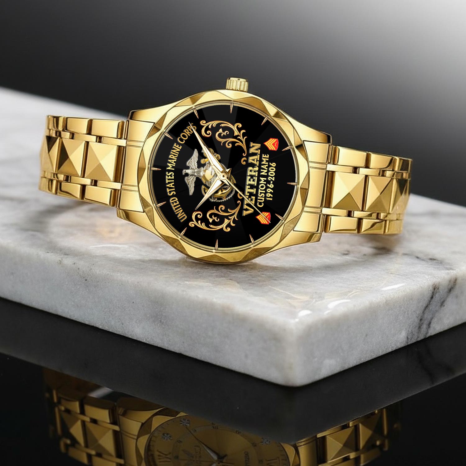 Customize your Diamond-Cut Bezel Watch with your name, rank, and years of service for a truly one-of-a-kind timepiece. This personalized feature allows you to showcase your military journey with pride and distinction.