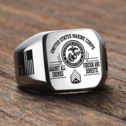 You’re enabled to customize your name, rank, rating, etc. to have them printed on the personalized engraved men’s ring. Make it uniquely yours by incorporating elements that celebrate your military identity and legacy.