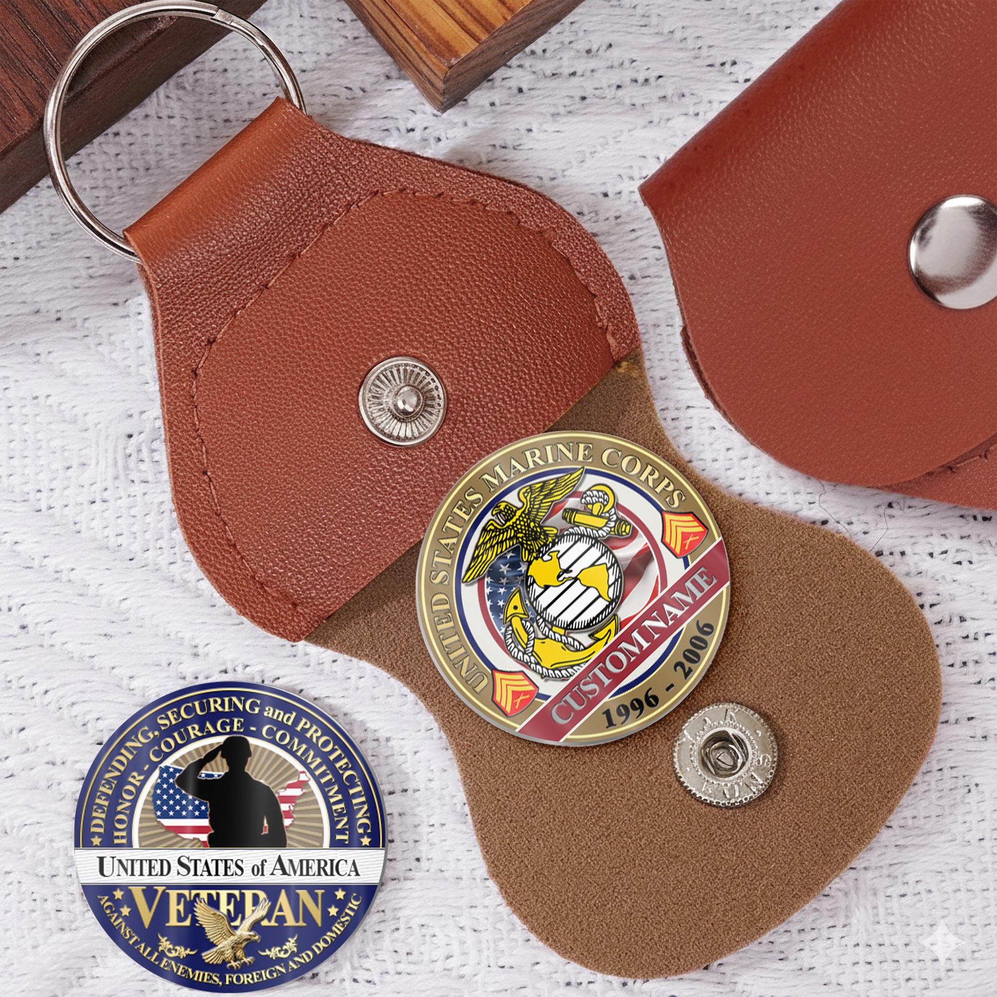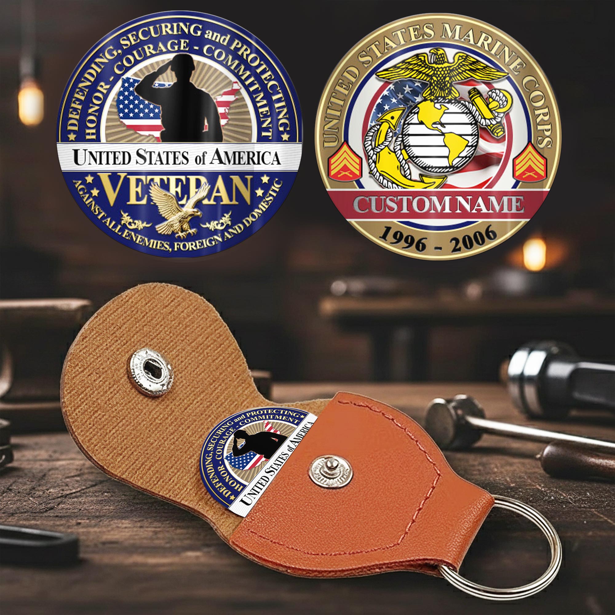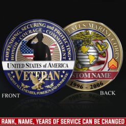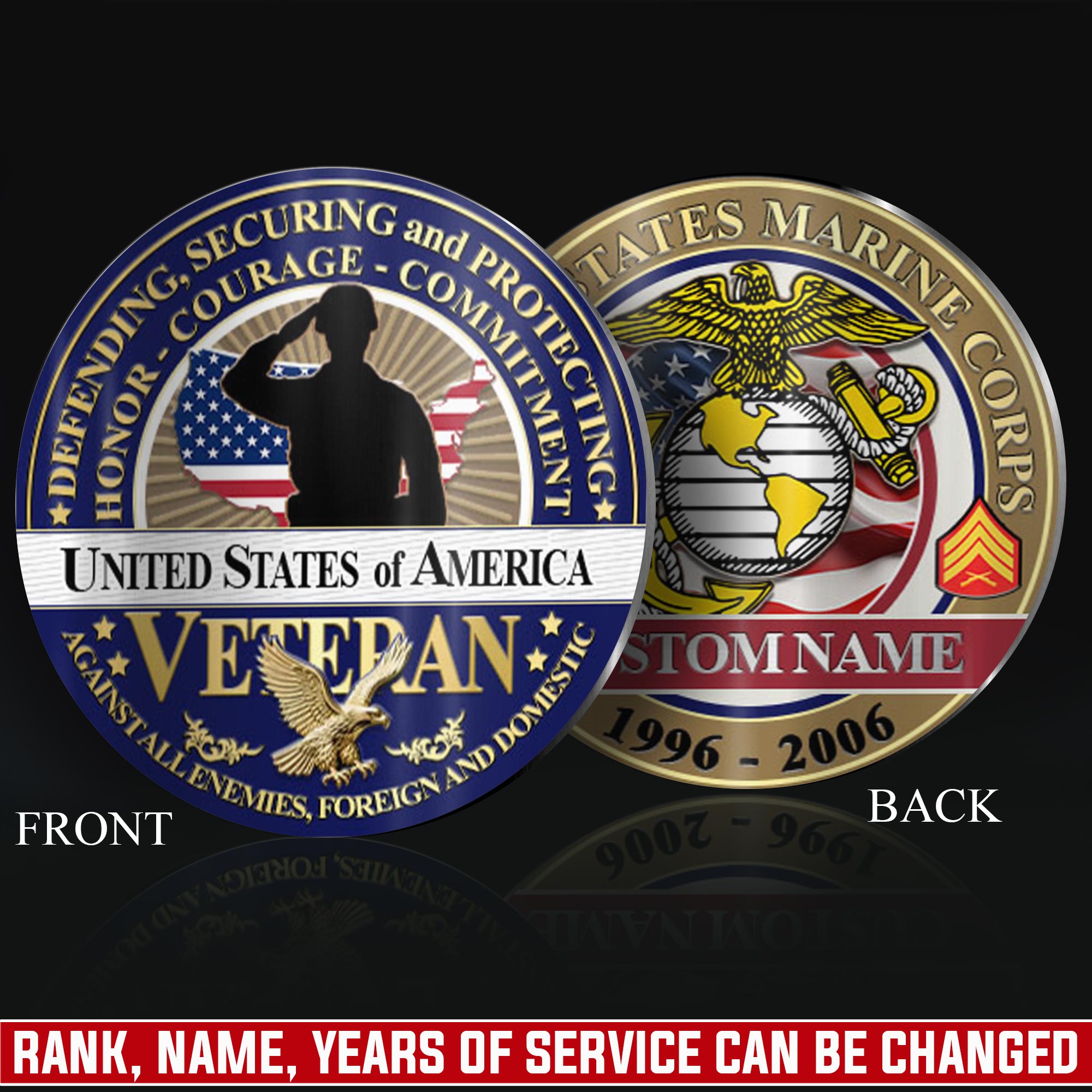 Honor Their Service: customize with veteran’s name, achieved rank, service branch, assigned unit, career specialty, or total years served on both coin faces.