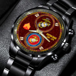 Elevate your Black Stainless Steel Watch with a personal touch by incorporating your custom details like name, rank, and years of service. This unique addition commemorates your military experience in a stylish and meaningful way.