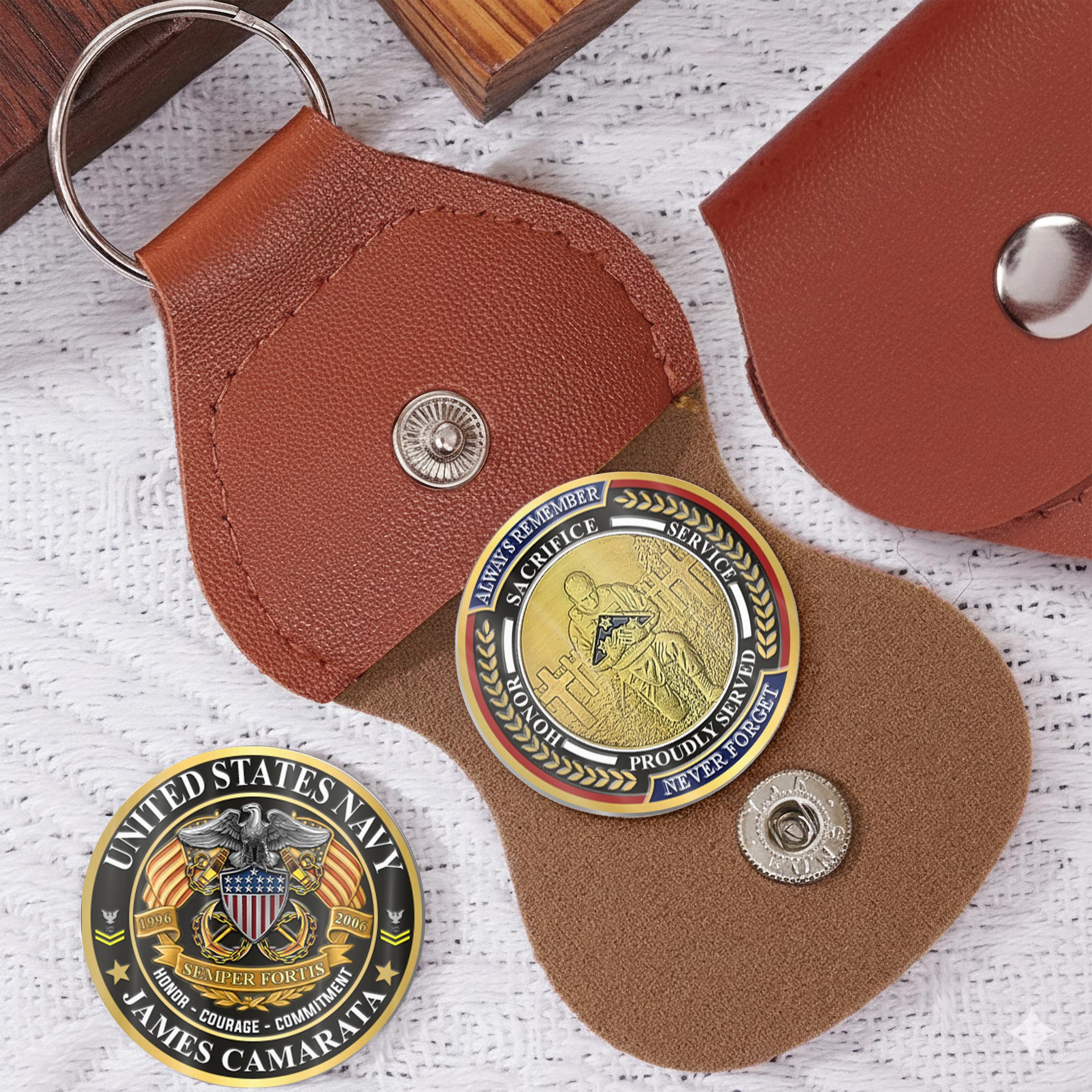 The Military Commemorative Challenge Coin showcases exceptional craftsmanship with detailed printings on both sides of solid stainless steel. Protected in a quality PU leather case with secure snap fastener, this coin honors military heritage and individual achievement.