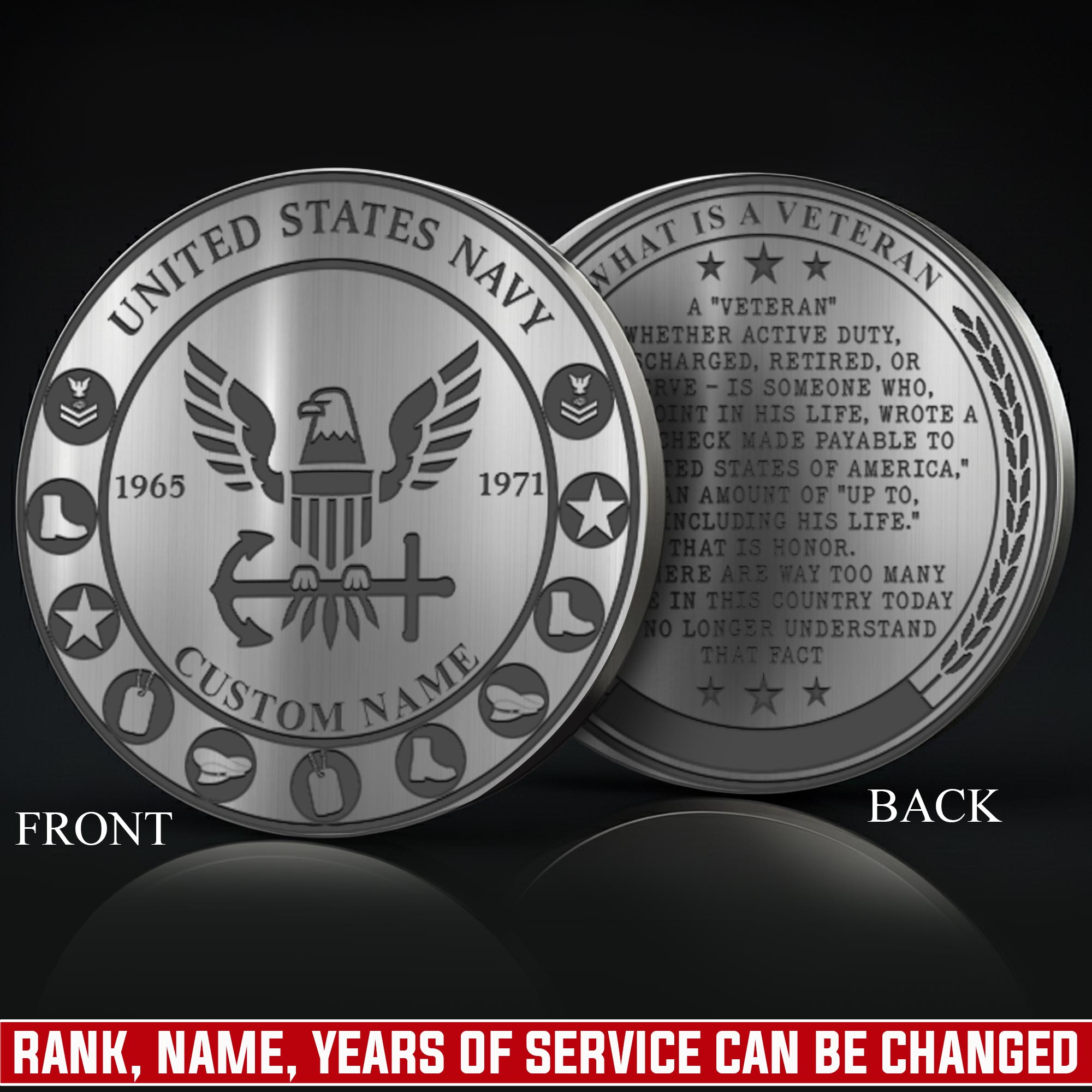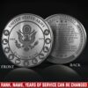Honor Their Service: customize with veteran’s name, achieved rank, service branch, assigned unit, career specialty, or total years served on both coin faces.