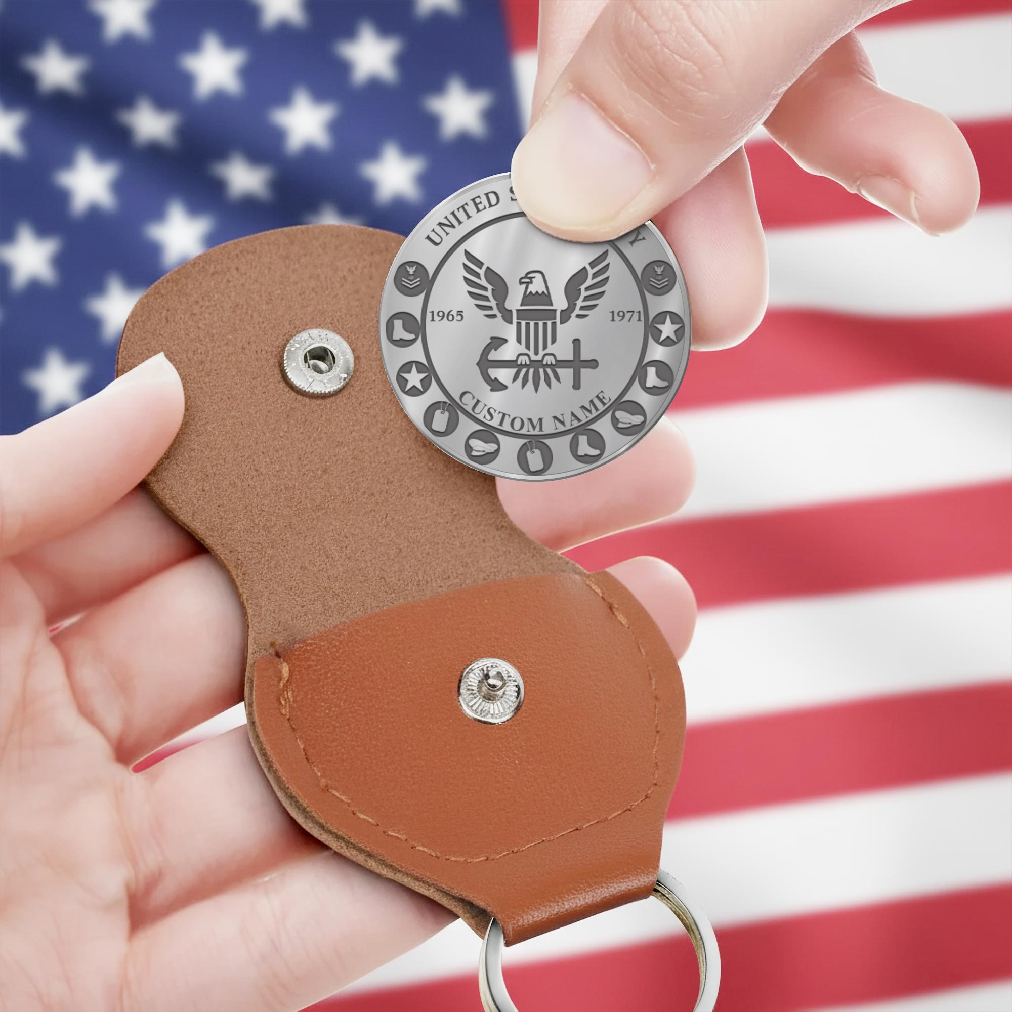 The Military Commemorative Challenge Coin showcases exceptional craftsmanship with detailed engravings on both sides of solid stainless steel. Protected in a quality PU leather case with secure snap fastener, this coin honors military heritage and individual achievement.