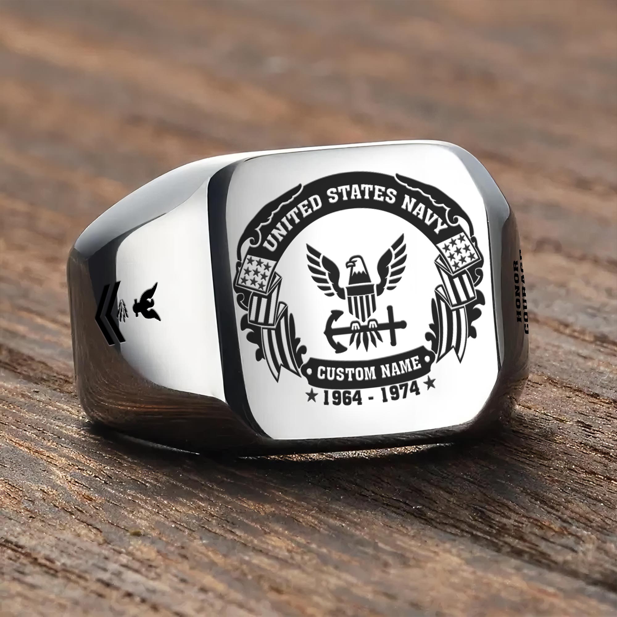 You’re enabled to customize your name, rank, rating, etc. to have them printed on the personalized engraved men’s ring. Transform this piece into a personal memorial of your service and accomplishments.