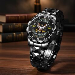 Elevate your Diamond-Cut Bezel Watch with a personal touch by incorporating your custom details like name, rank, and years of service. This unique addition commemorates your military experience in a stylish and meaningful way.
