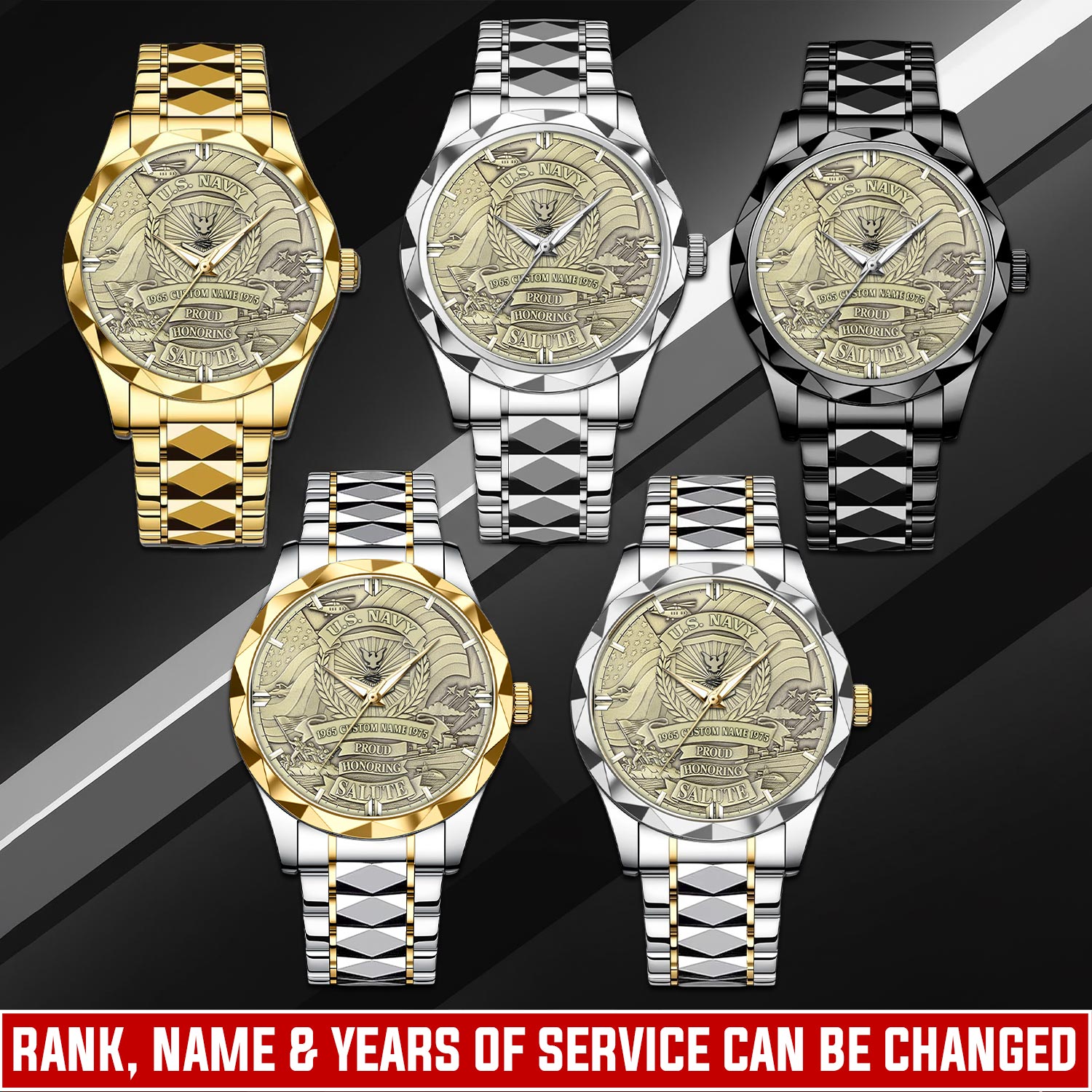 Make your Diamond-Cut Bezel Watch a reflection of your personal journey by including custom details like your name, rank, and years of service. This personalized feature not only adds a touch of elegance but also serves as a timeless tribute to your dedicated service to our country.