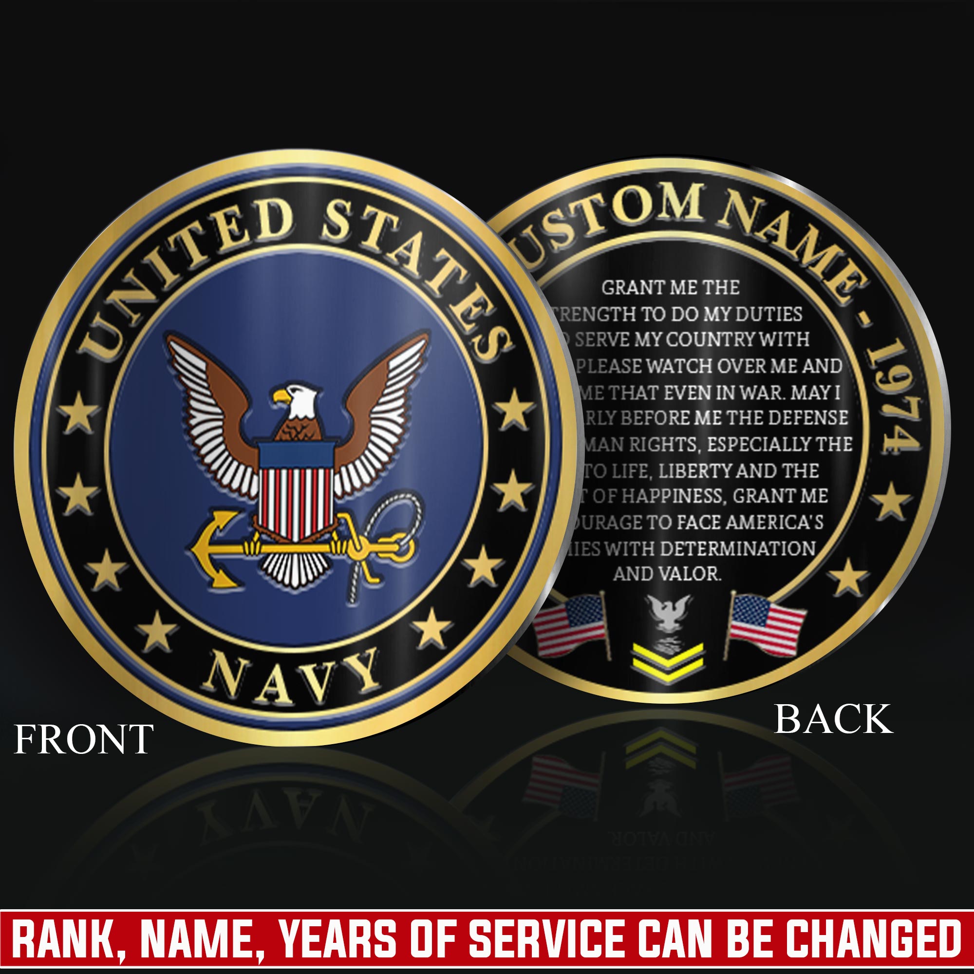 Personalize Your Coin: add custom printing including name, rank, military branch affiliation, unit number, specialty designation (MOS/rating), or deployment dates on both sides.