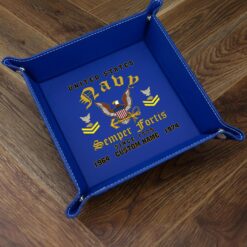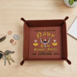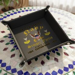 Featuring state-of-the-art UV printing technology, this valet tray promises permanent personalization that resists fading and peeling, with designs rendered in bold black that maintain their clarity indefinitely. The carefully selected vegan leather provides outstanding durability and texture while honoring cruelty-free values, and the corner-snap assembly system offers both stability during use and convenient collapsibility for storage. An essential organizational tool that honors military service while keeping everyday essentials like wallets, phones, and accessories beautifully arranged.
