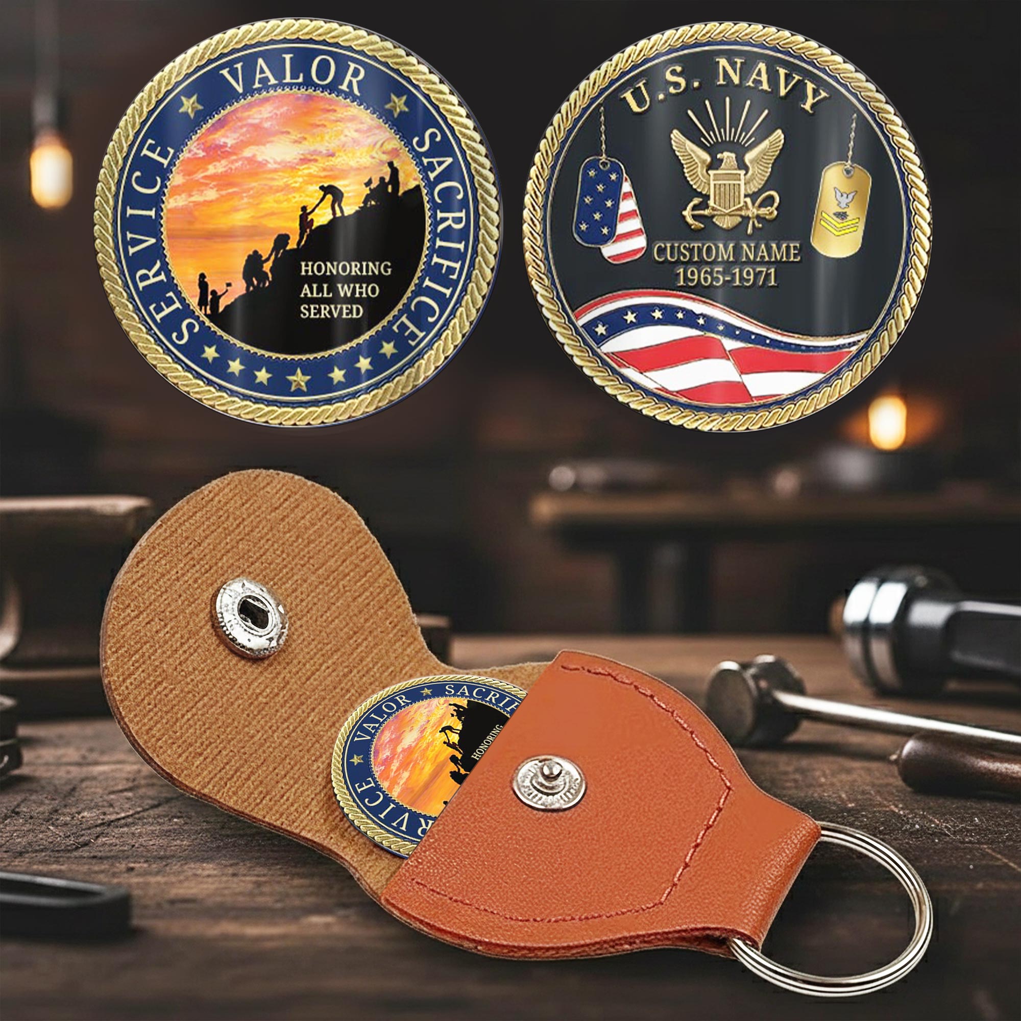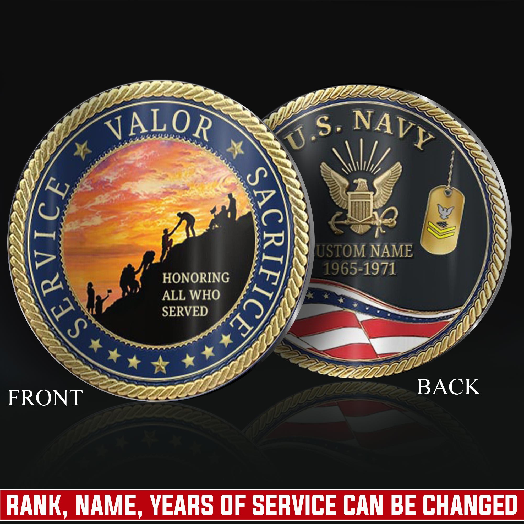 Add Your Personal Touches: you’re enabled to customize both sides of the coin with your name, rank, military branch, unit insignia, or service dates to create a personalized keepsake.