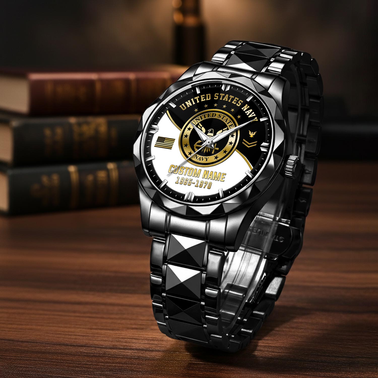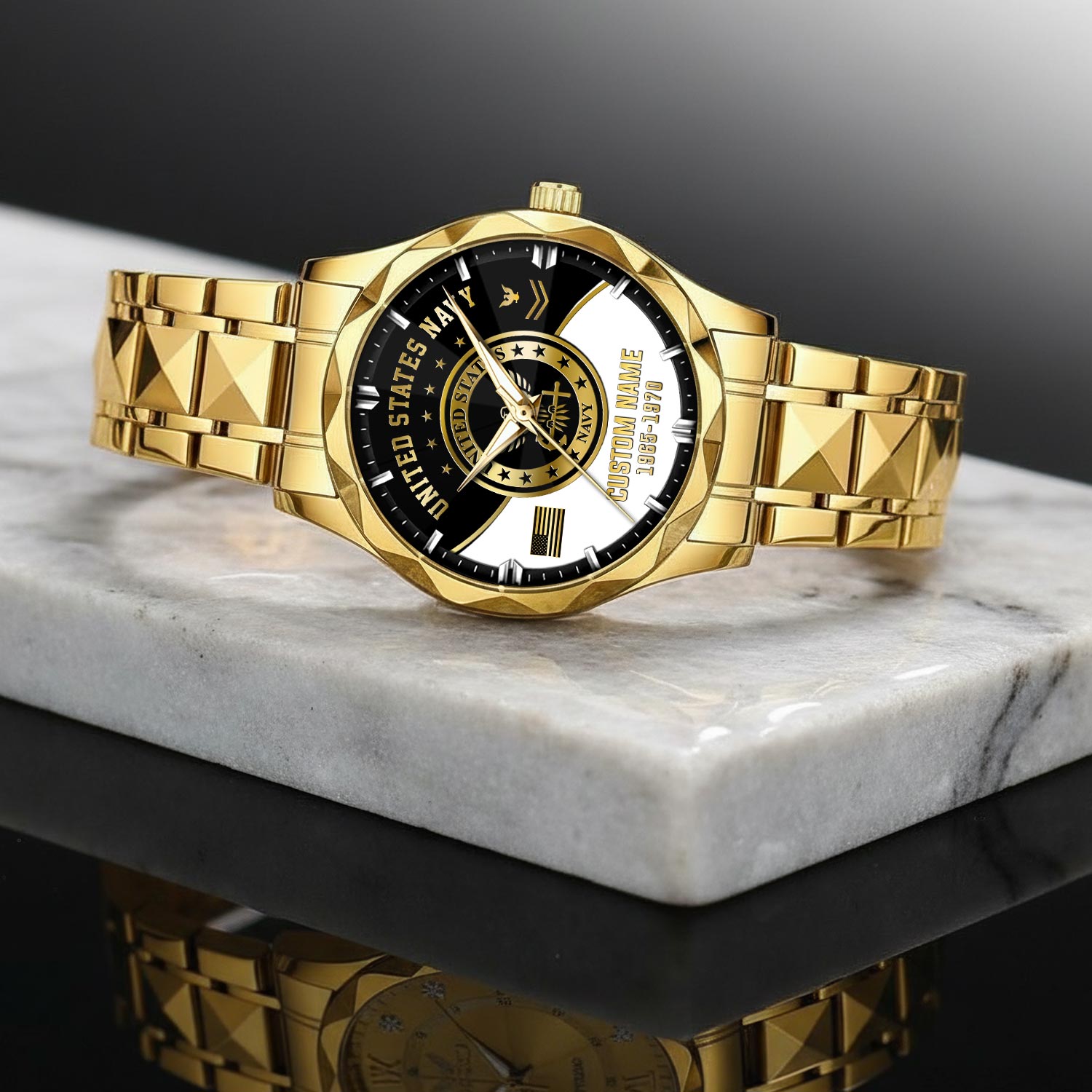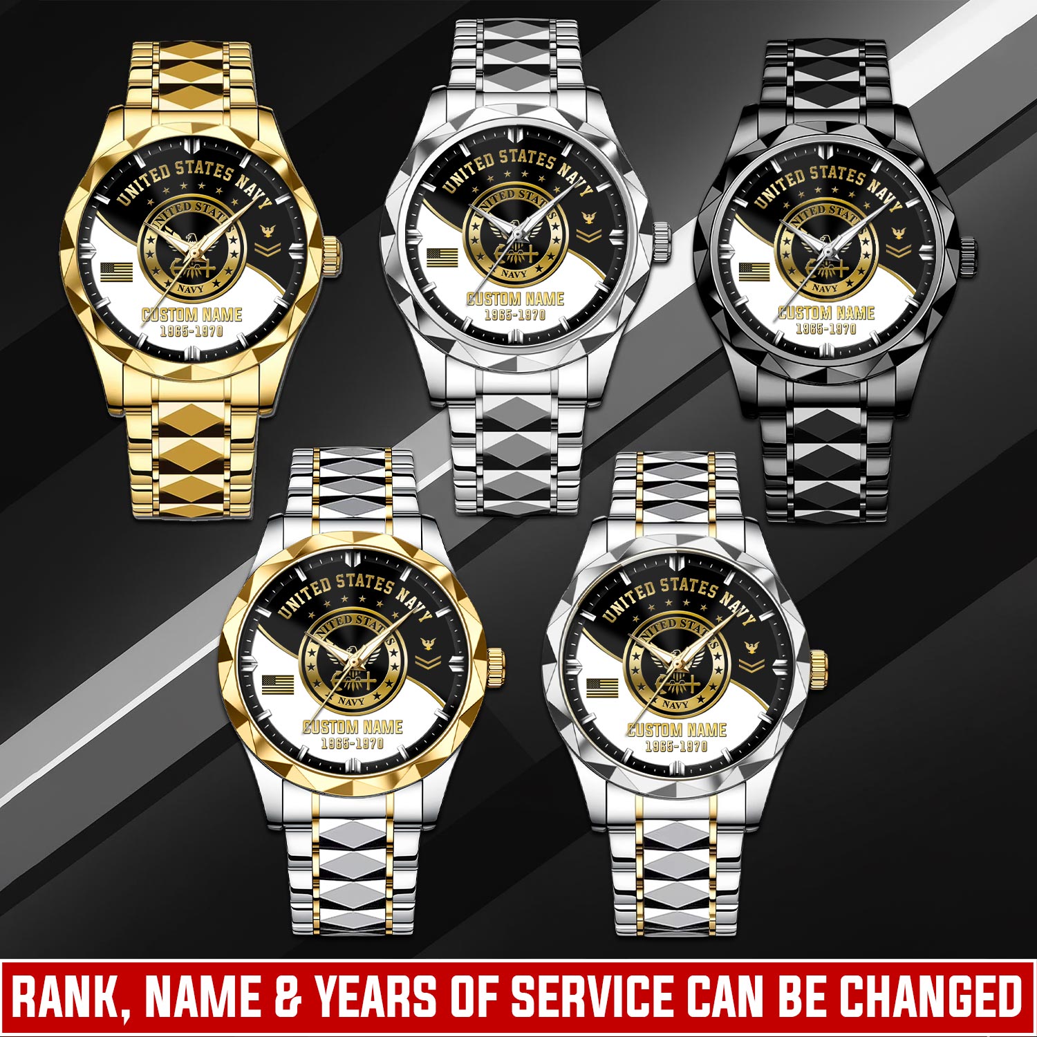 Customize your Diamond-Cut Bezel Watch with your name, rank, and years of service for a truly one-of-a-kind timepiece. This personalized feature allows you to showcase your military journey with pride and distinction.