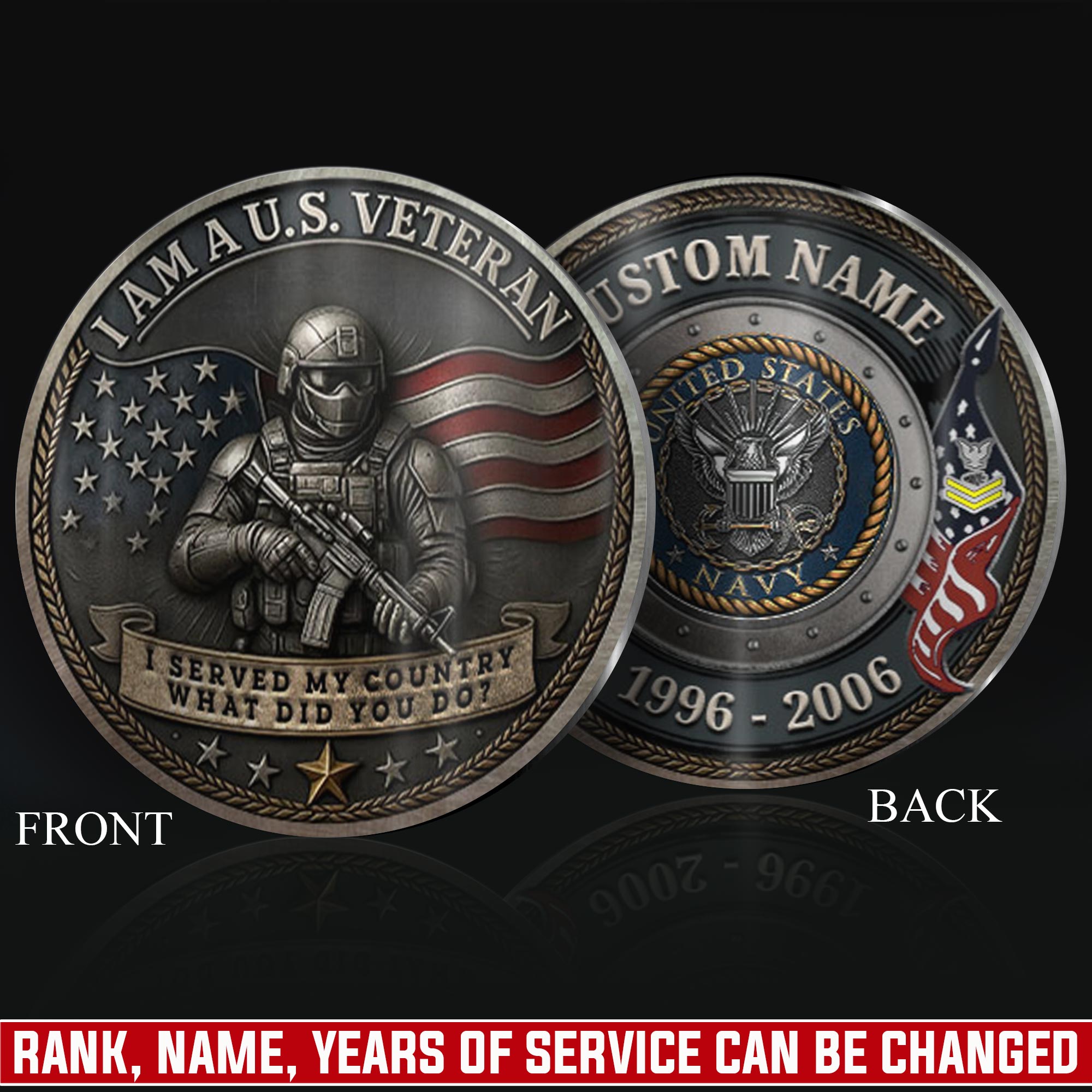 Personalize Your Coin: add custom printing including name, rank, military branch affiliation, unit number, specialty designation (MOS/rating), or deployment dates on both sides.