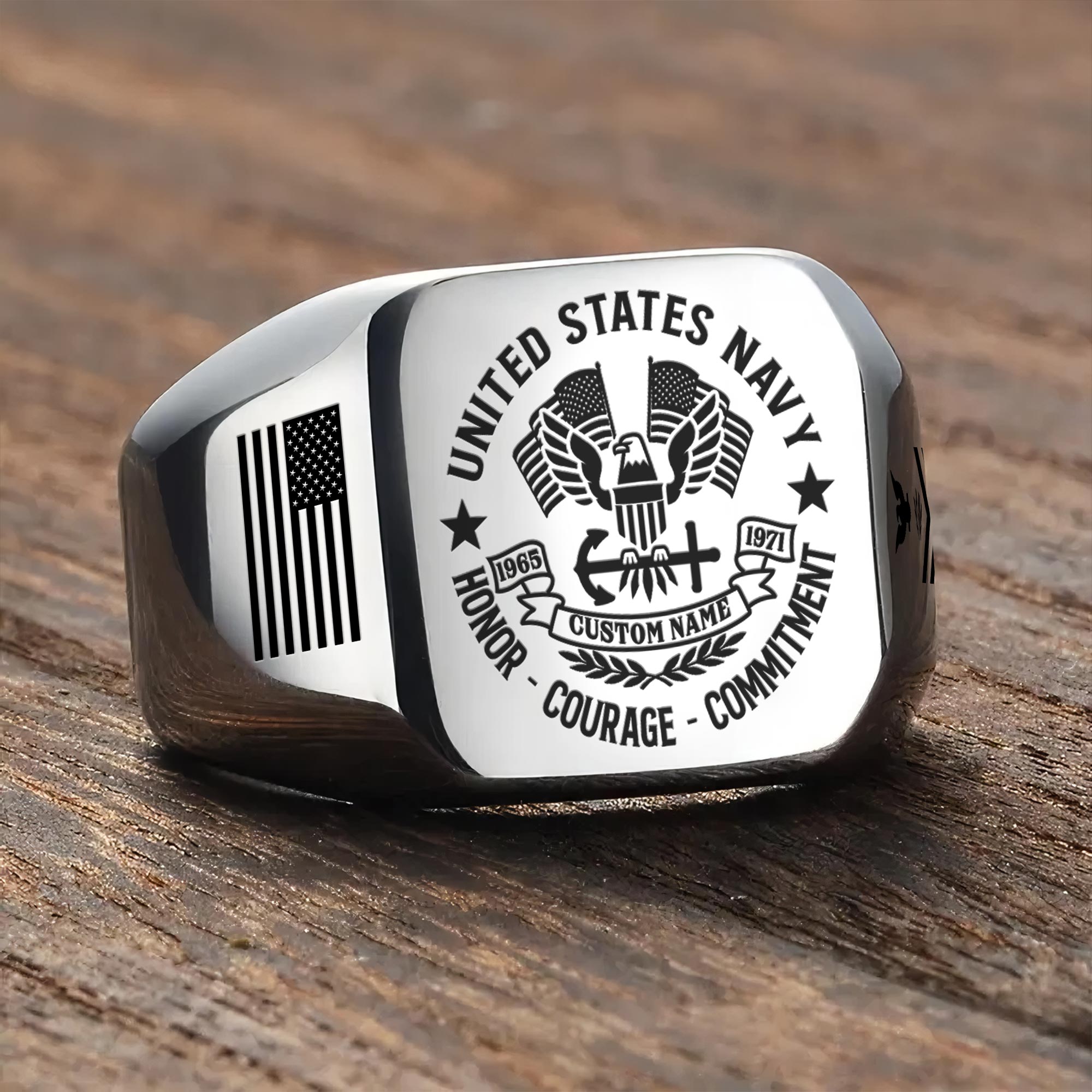 You’re enabled to customize your name, rank, rating, etc. to have them printed on the personalized engraved men’s ring. Make it uniquely yours by incorporating elements that celebrate your military identity and legacy.