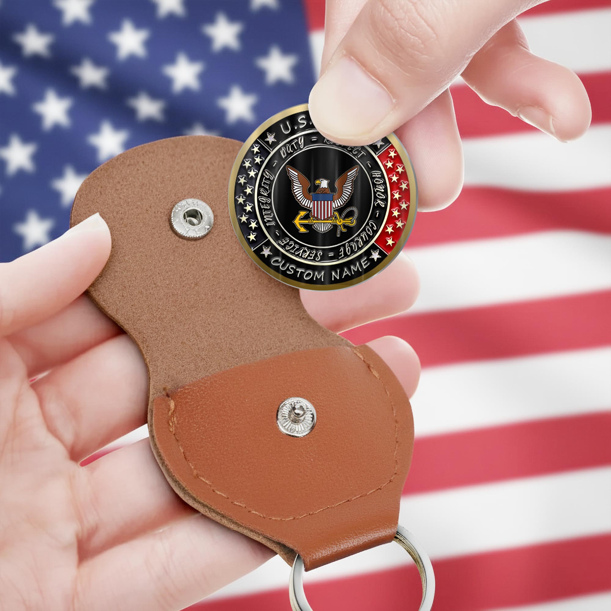 The Military Commemorative Challenge Coin showcases exceptional craftsmanship with detailed printings on both sides of solid stainless steel. Protected in a quality PU leather case with secure snap fastener, this coin honors military heritage and individual achievement.