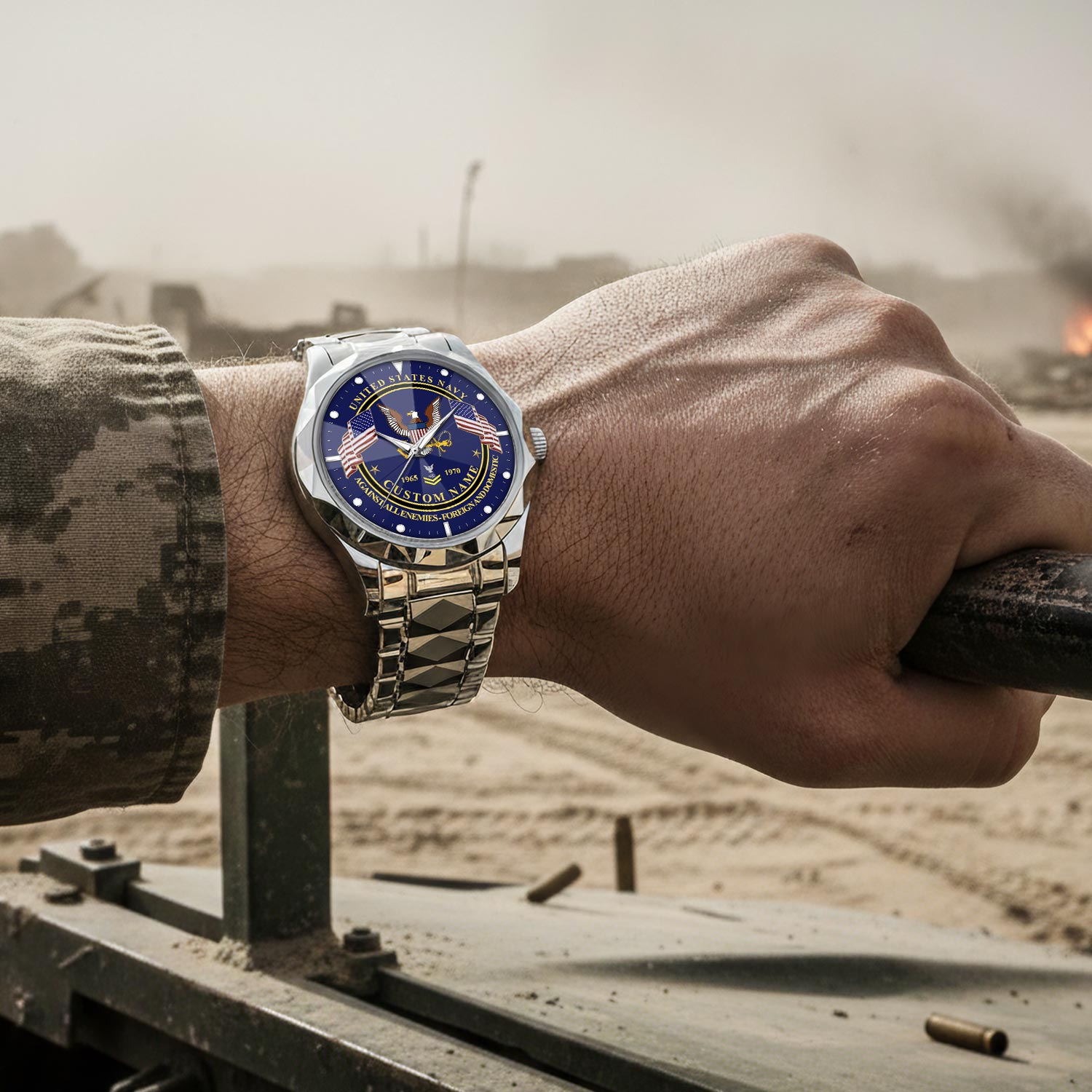 Elevate your Diamond-Cut Bezel Watch with a personal touch by incorporating your custom details like name, rank, and years of service. This unique addition commemorates your military experience in a stylish and meaningful way.