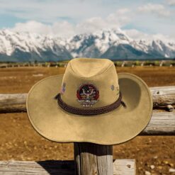 The hat features a genuine suede leather exterior that offers a luxurious texture and appearance, complemented by a moisture-wicking interior lining designed for enhanced comfort in warm conditions. The reinforced crown construction uses premium materials specifically chosen for superior shape retention over time. A protective coating has been carefully applied to resist fading and weathering, while the quality leather hatband displays an authentic grain pattern with natural flexibility that adapts to the wearer’s comfort needs.